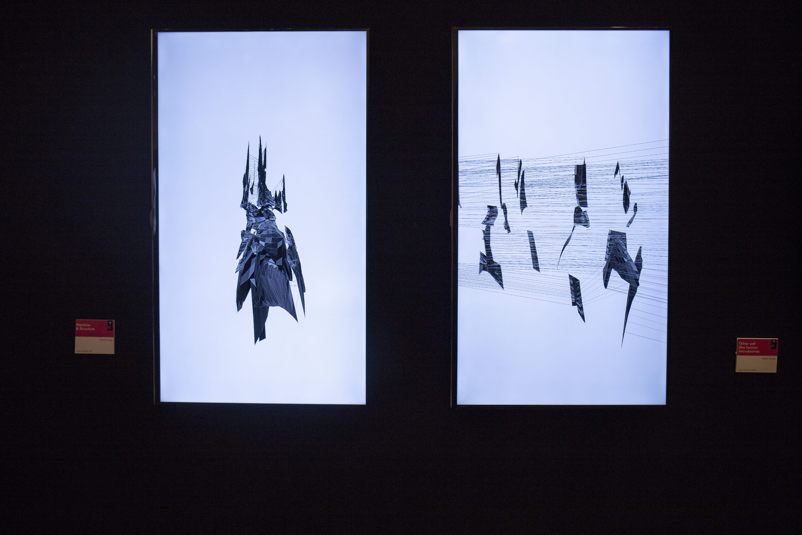Stasis, movement and kinetic saturation are the summary of spontaneous, primitive interactions of a machine imprisoned within its own code. Torsions, spasms, gentle whispers and harsh screams serve as a primitive language used by this virtual body to strive for his principle of existence. Machine & Structure is a serie of digital synaesthetic sculptures realized with custom made software and recorded in real-time. Shape and Sound are generated with the same algorithms causing a continuous feedback between visual and aural planes, with the aim to depict a virtual organic being with his own behavior. Torsions, spasms, gently whispering then harsh screams are the primitive language used by this virtual body to declare his principle of existance. Machine and Structure can be presented as audiovisual installation for two large screens facing each others and two fullrange loudspeakers.